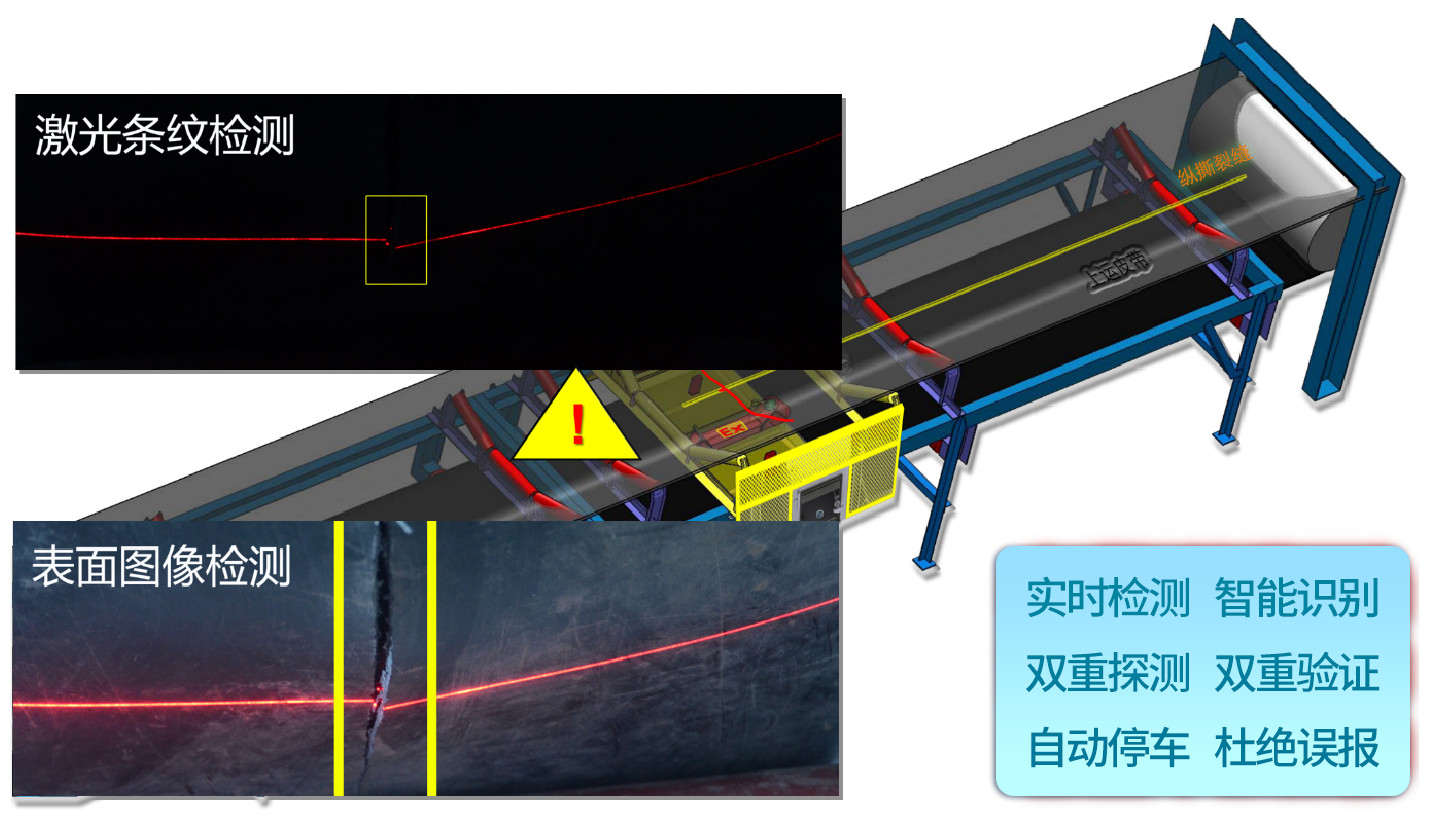 斗轮机操作人员识别验证采用深度学习算法,支持离线比对,人脸比对时间<0.2s/人,人脸比对准确率≥99%;输送带纵向撕裂检测装置使用激光束扫描皮带表面,相机采集图像信息,独立鉴定,相互验证,当两种手段100%确认了纵向撕裂发生,系统才进行报警。