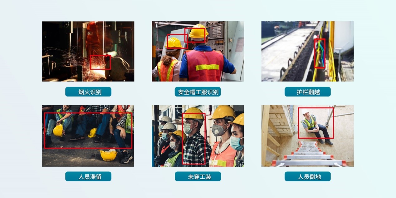 将部署在输煤区域的摄像头,统一接入边缘智能服务器进行实时推理分析,通过部署人工智能算法,实现对未佩戴安全帽、电子围栏、区域入侵、护栏翻越、人员静止等场景的识别功能并自动告警。