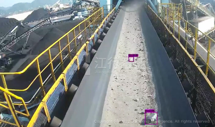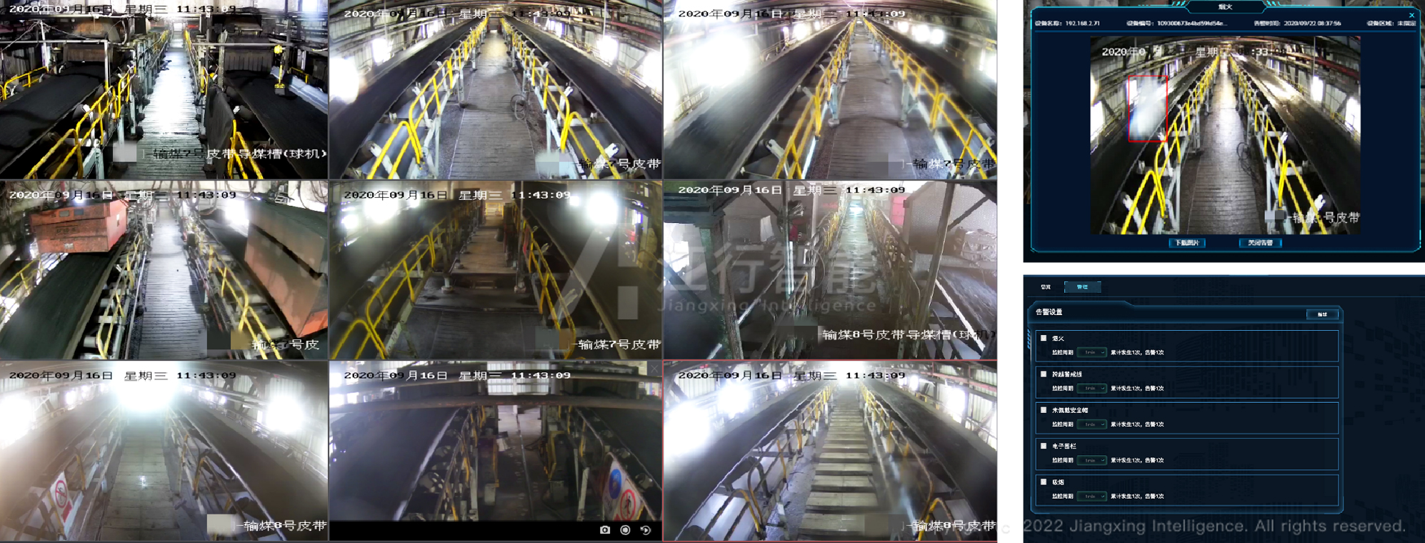 通过在输煤系统周围部署高清监控摄像头,并将摄像头和声光报警器接入智能服务器,通过部署人工智能识别算法,ai赋能分析,识别皮带撕裂、跑偏、异物(石块、铁块、木块),从而实时检测输煤系统运输情况,对人员翻越行为进行声光报警,提醒人员离开皮带区域,注意人身安全。